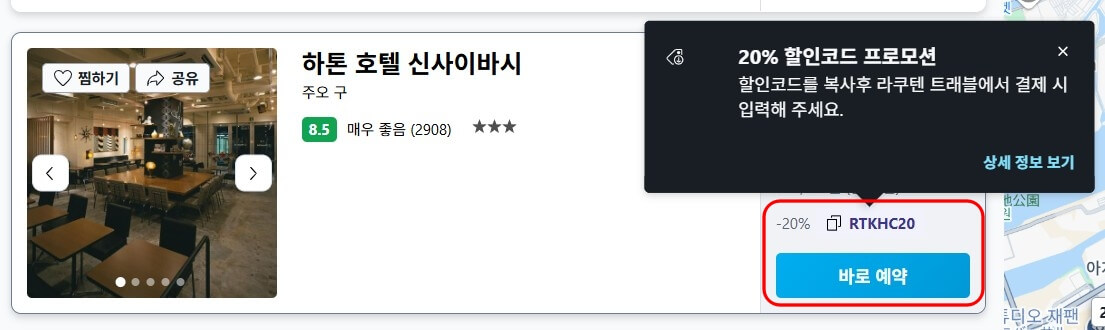 3. 라쿠텐트래블 상품 선택 후 코드복사 - "바로 예약" 버튼 클릭