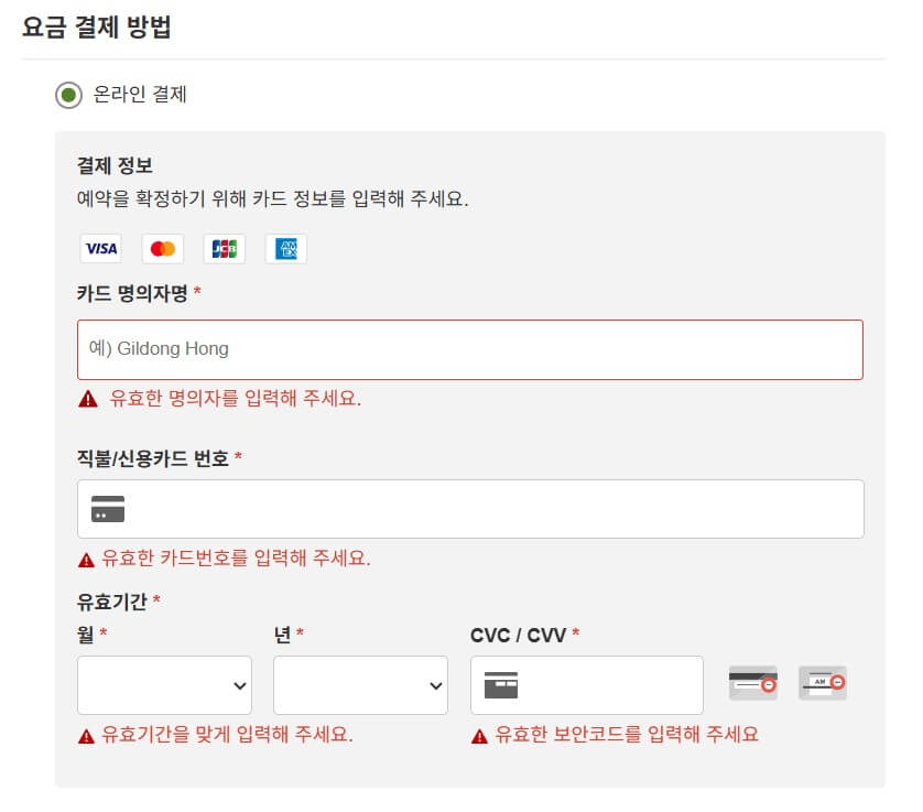 6. 결제 단계로 진행 클릭 후 결제정보 입력 및 예약 확정