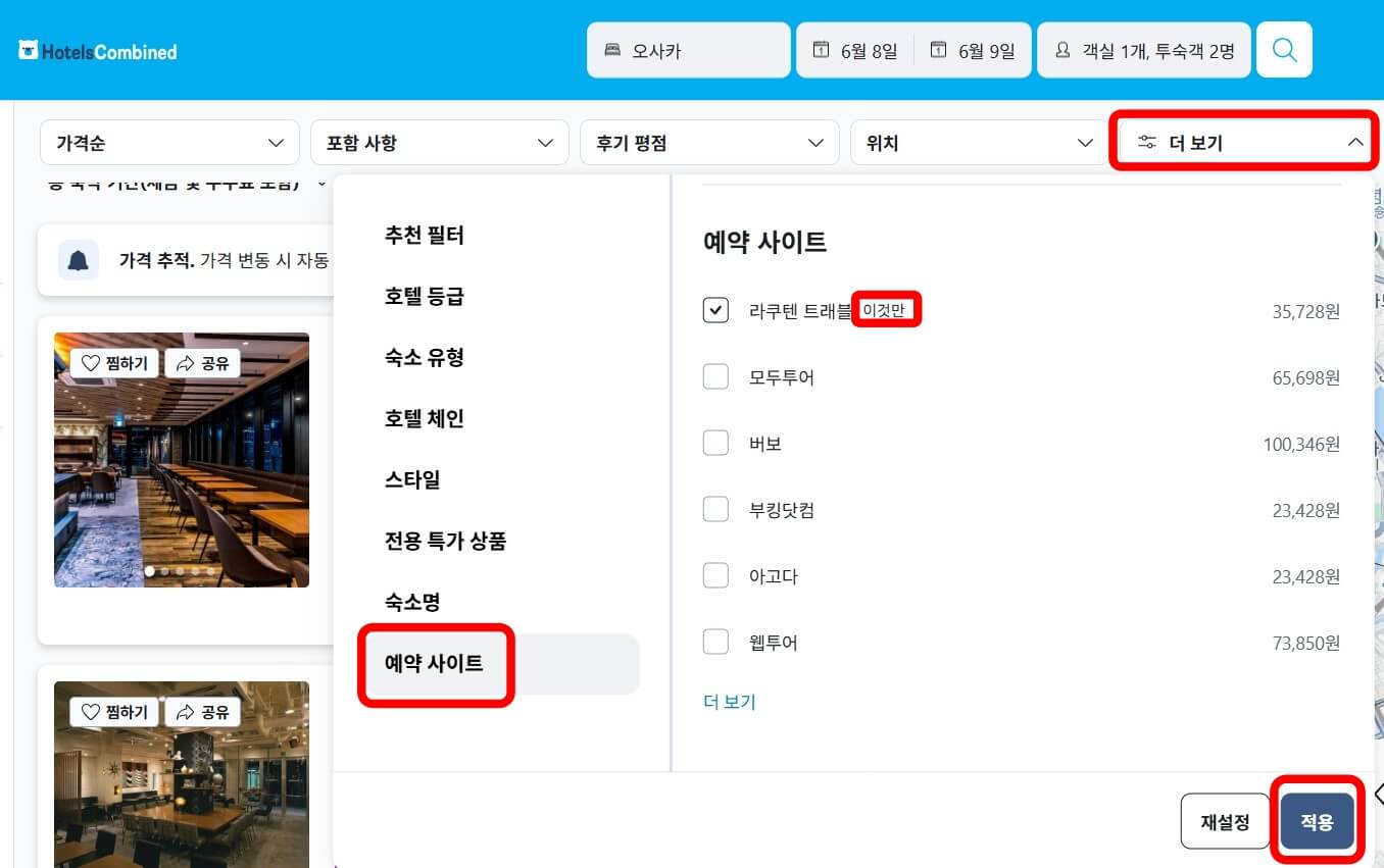 상단 오른쪽 '더 보기' 필터 선택 후 가장 아래 '예약 사이트' 선택 - 라쿠텐 트래블만 체크 후 검색하면 해당 상품만 골라서 볼 수 있어요!